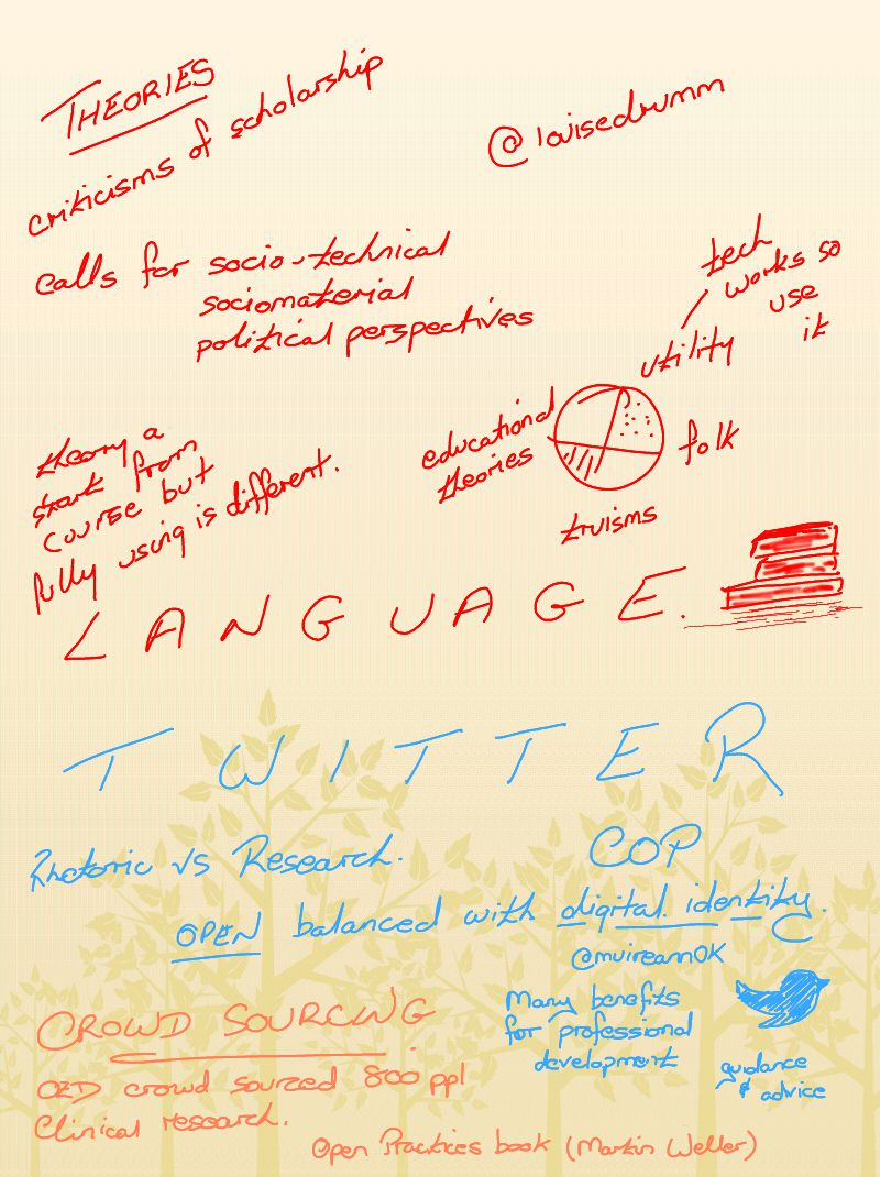 The day involved excellent keynote talks from Professor Sian Bayne, Professor Grainne Conole and Professor Paul Conway, research presentations and a round table discussion. I have added all my scribbles from the day below but I wanted to highlight a few of my personal take home messages (note there were several parallel sessions so my notes only cover those that I attended). Many of the talks were recorded and you can view these via the conference website.